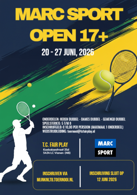 Van zaterdag 20 t/m zaterdag 27 juni 2026 organiseren we weer ons eigen open toernooi voor de heren dubbel, dames dubbel en gemengd dubbel.